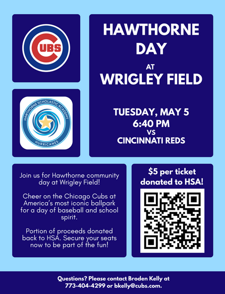 Join us for Hawthorne Community Day at Wrigley Field! Come cheer on the Chicago Cubs as they take on the Cincinnati Reds for an evening of baseball, school spirit, and staff appreciation.